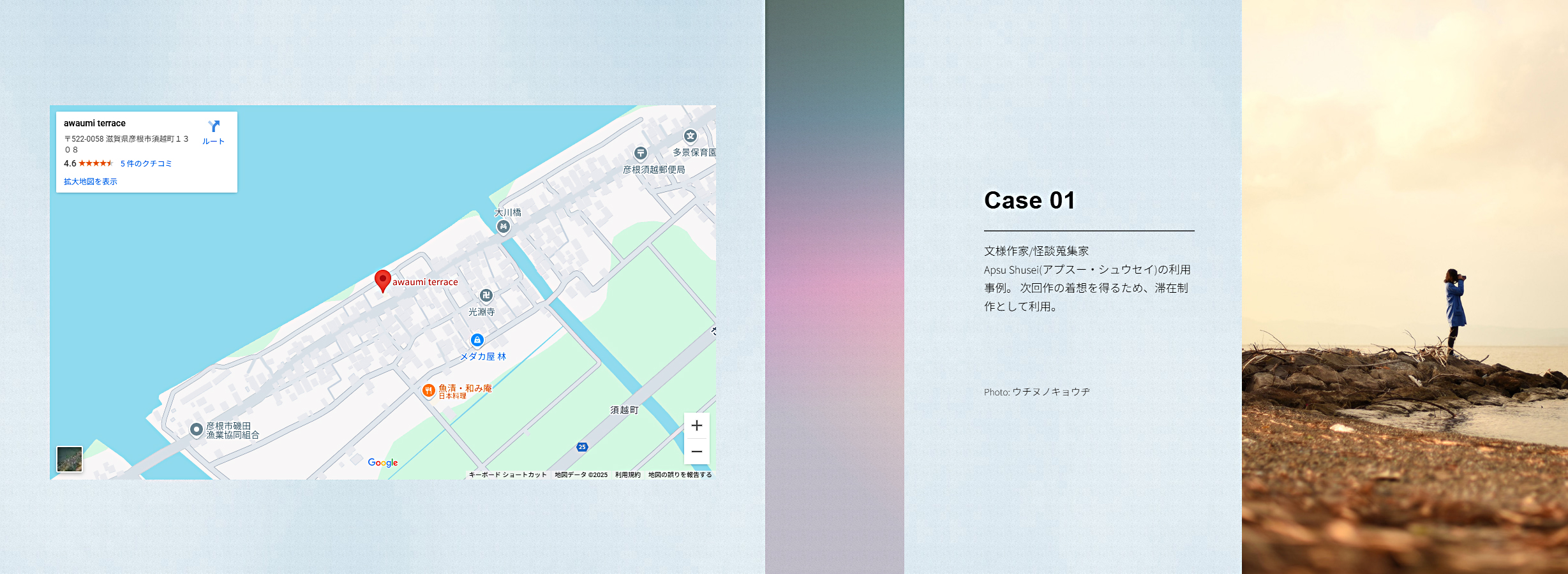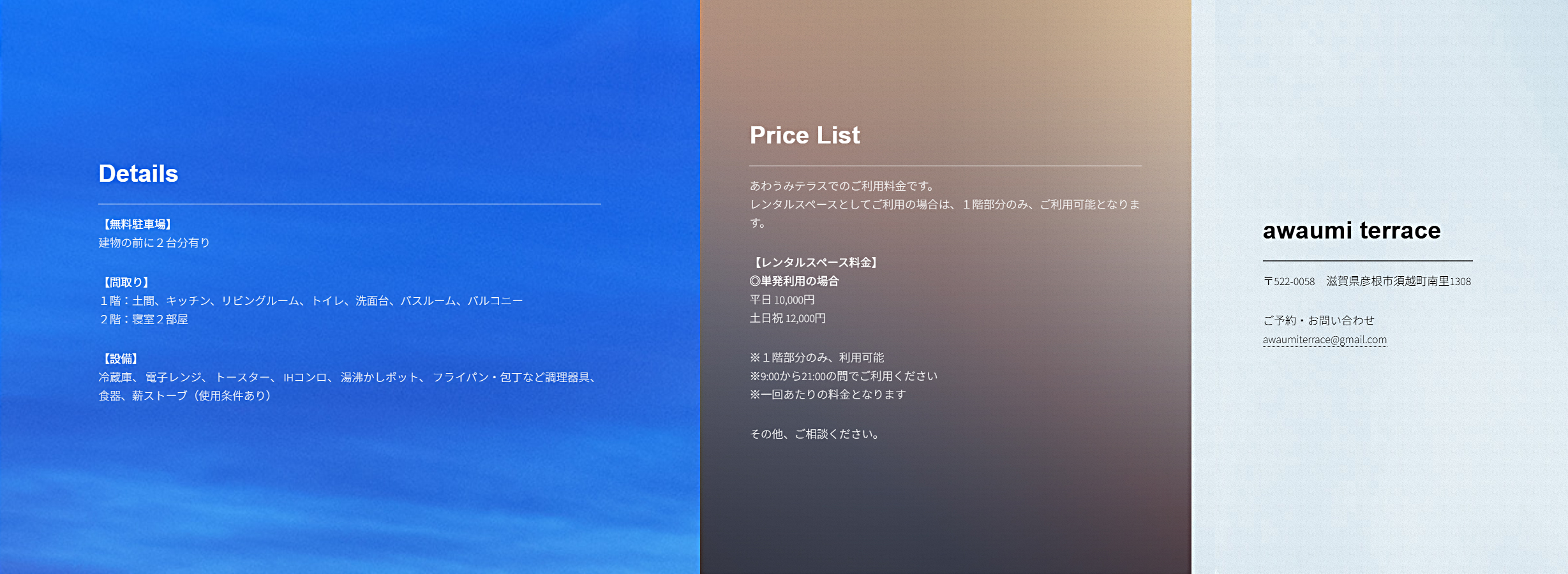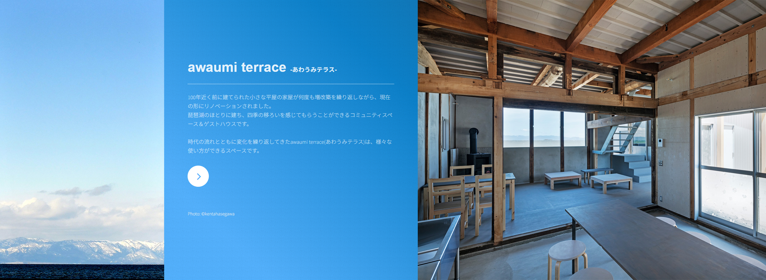 awaumi terrace 琵琶湖のほとりに建ち、四季の移ろいを感じてもらうことができるコミュニティスペース&ゲストハウス awaumi terrace あわうみテラス のホームページ > Visit site web design + coding